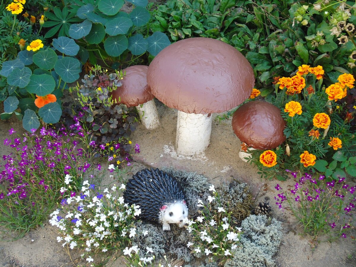 Чтобы сделать шляпку для гриба,нужно просто взять небольшую чашку с овальным дном и вдавить её в рыхлый грунт(песок).Затем положить целлофан и снова вдавить. Приготовить небольшое количество раствора,в зависимости от того сколько грибов вы хотите сделать.Залейте углубление раствором.Через 1 час,когда раствор начнёт схватываться вставьте в середину шляпки гвоздь. На следующий день сделайте из куска рубероида трубку для ножки гриба,обмотайте её скотчем или шпагатом,поставьте на шляпку гриба так,чтобы гвоздь был внутри трубки.Снаружи трубку обсыпьте песком,а во внутрь залейте раствор. На следующий день вытащите гриб из земли,уберите целлофан и рубероид.Чтобы ваш гриб не падал,можно взять просто два кирпича,положить две рейки,поставить на них гриб и залить подставку.Когда раствор высохнет,раскрасьте гриб,на ваш вкус.Просто и красиво,дешевле,чем покупать.Успехов вам!