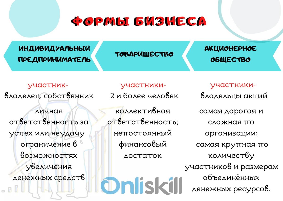 Поговорим о бизнесе. Что это такое, какие виды и формы бизнеса существуют. Бизнес - это деятельность человека, направленная на получение прибыли. Существует большое количество разного вида бизнеса. 1. Производственный бизнес. Изготовление товаров или услуг 2. Торговый бизнес. Продажа товара после производственного бизнеса 3. Финансовый бизнес. Предоставляет деньги, кредиты. 4. Страхование. Хранилище денег. 5. Посреднический бизнес. Помощь при совместной работе (продавец и покупатель). Например : риэлторская копания. Форма бизнеса зависит от того, работает предприниматель самостоятельно или объединяется с другими предпринимателями, пользуется только своим имуществом или привлекает также имущество других лиц, использует свой труд или труд наёмных работников. Разберем распространенные формы подробней. ИП (Индивидуальное предприятие) Предполагает одного владельца, один собственник. Это самая распространенная форма бизнеса, поскольку она проста в создании и управление. Минусом дан