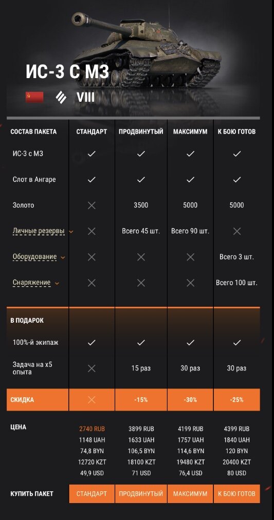 Привет, друзья! С 3 мая 12:00 (МСК) по 18 мая 12:00 (МСК) в премиум магазине можно будет купить советский тяжелый танк ИС-3 с МЗ. В этой статье мы разберемся стоит его покупать или нет. Давайте приступим к обзору. Механизм обратного дозаряжания это не просто красивое название, а изюминка данного танка. Кассета на три снаряда с альфой 390 единиц за выстрел. Советский механизм дозаряжания полностью противоположен итальянскому. Первый снаряд заряжается за 11 секунд, второй за 14, третий за 17. Полная перезарядка кассеты 44 секунды. Да долго, но дело в том, что для максимального урона в минуту необязательно ждать полной перезарядки кассеты, а как раз-таки, наоборот, когда полностью разрядили три снаряда, нужно сразу же начинать вести огонь циклично, и в этом случае уже средний урон минуту будет достигать 2730 единиц. Согласитесь такие цифры на восьмом уровне не могут не радовать. Точность оставляет желать лучшего. Время сведения почти 2,9 секунды, разброс на 100 метров 0.44. Это самый б