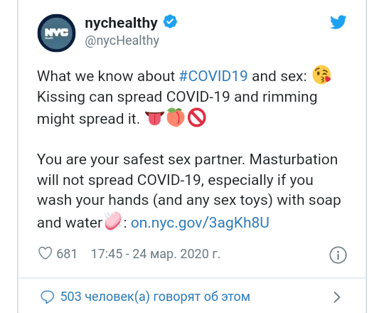 Вирус COVID-19 вносит свои коррективы в жизнь людей и пока в России говорят о "карантинной депрессии", в Америке ведут речь о мастурбации... Да, в период карантина по коронавирусу американцам предлагается почаще мастурбировать; подобная рекомендация была высказана гражданам врачами из Департамента здравоохранения и психической гигиены Нью-Йорка. Согласно утвержеднию нью-йоркских медиков поцелуи, вагинальный и оральный секс являются распространителями инфекции, в виду чего самым безопасным половым партнёром для человека оказывается он сам. Что касается гигиены, то её рекомендуется соблюдать и здесь - прежде чем перейти к акту самоудовлетворения рекомендуется намылить руки и смыть их водой. Стоит отметить, что мастурбация в целом расценивается американскими врачами положительно, поскольку она снижает стресс и, к тому же, укрепляет иммунитет. Однако медики в Нью-Йорке отличаются своей предусмотрительностью и для людей, не приемлющих мастурбацию по тем или иным соображениям и ратующих з