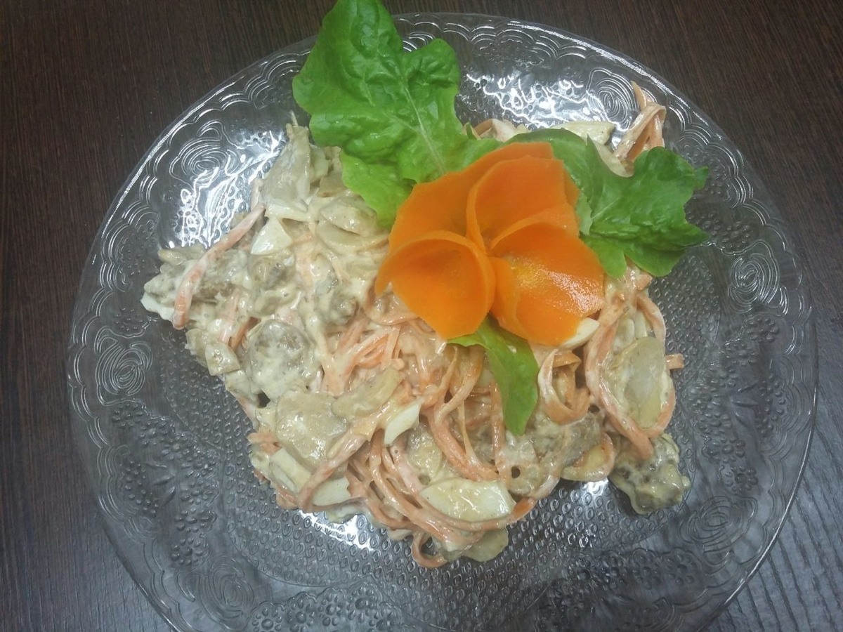 Этот салат стал одним из любимых в нашей семье. Много лет прошло с тех пор, когда я в каком -то журнале прочитала рецепт и вот теперь почти каждое праздничное застолье не обходится без этого блюда. В состав салата входит : морковь по-корейски, вареные яйца, жареные шампиньоны с луком и жареное мясо и заправляется майонезом. Немножко трудоемко, но оно того стоит. Все ингредиенты можно приготовить с вечера, а в день подачи -собрать и заправить наш салат. Получается необычный, пикантный вкус у салата.