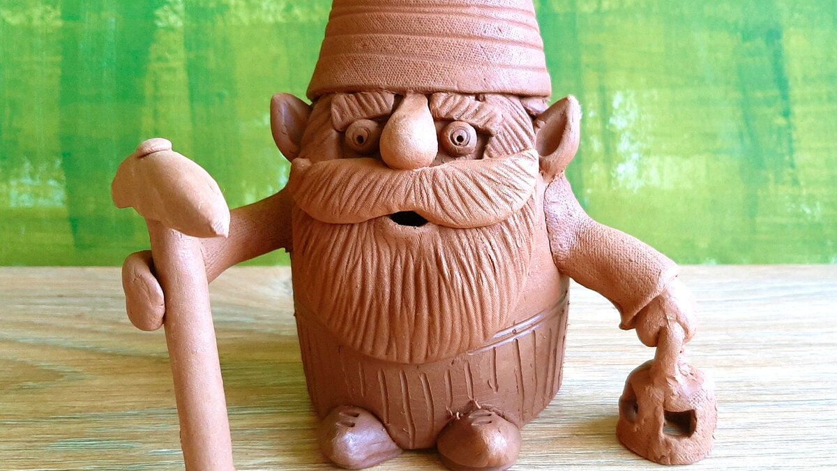 В качестве основы для скульптурки удобно использовать гончарную форму. В данном случае это простой цилиндр закрытый сверху. Обратите внимание, что в процессе изготовления в нем делаются отверстия. Они необходимы для того чтобы при обжиге газы не разорвали форму. Например газы могут скопиться под бородой, что в итоге может привести к ее разрушению в печи. Керамика полна сюрпризов. Работа с глиной требует внимания и практики. Этот материал не прощает пренебрежительного отношения к технологии процесса. Вот и у меня случилось так, что я немного пересушил кирку. Она уже была в "кожетвердом"* состоянии когда я ее приклеивал. Я хорошенько ее намочил и смазал жидкой глиной в момент склейки, но увы сегодня с кирка благополучно отвалилась, упала и распалась на две части. Можно конечно впоследствии приклеить ее на глазурь, но я такие штуки не люблю, лучше сделать заново. * Состояние глины, когда она уже не лепится но еще сохраняет влажность называют "Кожетвердым" состоянием. В таком состоянии о