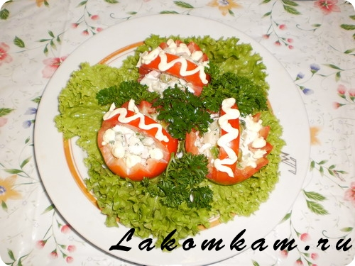 Помидорчик наш готов, теперь заполняем его салатом и подаём на стол.