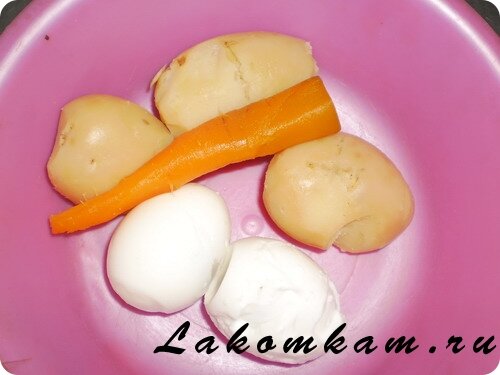 Блюдо из овощей «Помидор фаршированный салатом Оливье». Приготовление. Картофель, морковь и яйца варим.