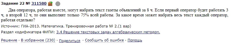 Перед началом обращусь к вам с просьбой. Я пытаюсь помочь вам, а вы помогайте мне :) Обязательно дочитывайте до конца, подписывайтесь на канал, задавайте свои вопросы по математике в комментарии или в соцсетях по ссылкам на канале. Помогайте мне продвинуть канал :) Уважаемые читатели, это будет последняя статья по ОГЭ. Далее разборы будут в интенсиве, который начнется уже скоро :) Стоит заметить, что задачи на работу очень похожи на задачи на движение. А=v*t, где А - это полная работа, v-производительность или скорость, а t - время. Все также, как и в движение по прямой. Интересны задачи только такого типа, где нет сведений о полной работе. В таких задачах я рекомендую полную выполненную работу представлять равно 1. Возьмем за время первого оператора Х часов, а второго У. Тогда 1/х - это время первого оператора на выполнение работы, а 1/у - время второго. Сумма 1 и 2 оператора будет равна их суммарному времени или 8 часам. В таких задачах нужно составлять систему уравнений. Первое уж