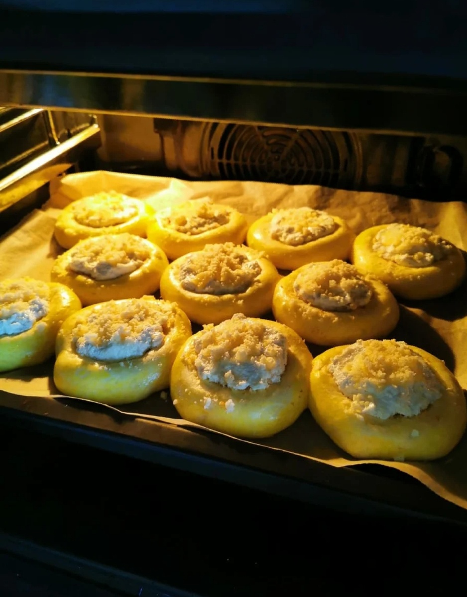 Всем привет!👌 Для поддержания духа и отличного весеннего настроения, я выступаю с предложением приготовить очень милые ватрушки.🥧 Для дрожжевого теста нам понадобится: 10г. Сухих дрожжей. 1,5 стакано тёплого молока или воды. 2 столовые ложки сахара. 3 столовые ложки растопленного масла. 450г. Муки. 1 желток. 1 желток для смазки. Щепотка соли. Для начинки: 500г. Творога. 4 столовые ложки сахара. 4 желтка. 2 столовые ложки сметаны. 2 столовые ложки растопленного сливочного масла. Цедра 1 лимона. Для теста смешиваем все ингредиенты до эластичной массы, оставляем на несколько минут, что бы оно подошло. Для начинки, отдельно взбиваем желтки с сахаром, затем добавляем остальные уже смешанные ингредиенты. Делим тесто на 15 частей, делаем сплющенные шарики, выкладываем их на противень. Стаканом продавливаем лунки, заполняем их творожной массой. Обмазываем желтком и ставим в духовку, разогретую до 220' на 30 минут. Приятного аппетита!