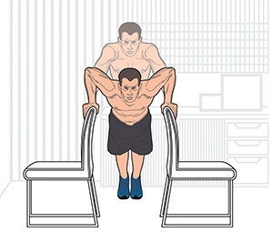 Упражнения Сеты Повторы Отдых1. Отжимания от стульев3660 сек.2. Подтягивания на полотенце4Мах60 сек.3. Разводки на полотенцах4660 сек.4. Изометрический тренинг груди330 сек.45 сек. Отжимания от стульев Мышцы: грудные, трицепсы, дельтовидные Поставь два стула спинками друг к другу и встань в упор лежа, расположив руки на стульях. Расстояние между стульями — ширина твоих плеч. Если ты достаточно силен, а ст