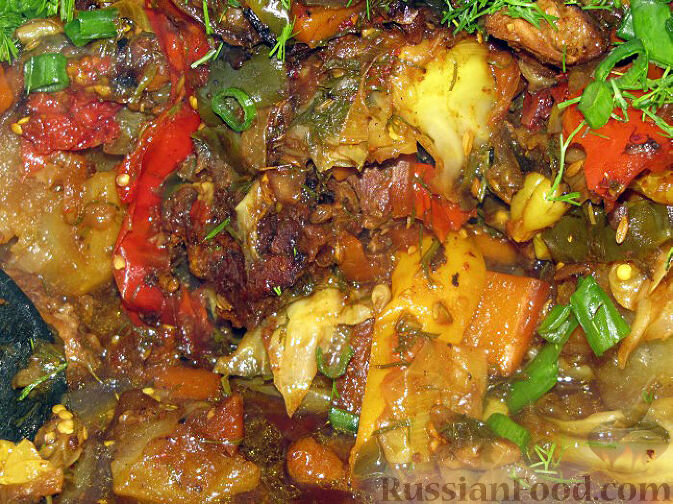 ингредиенты Продукты Мясо (шея) - 2 кг Баклажаны - 3 шт. Перец болгарский - 2 шт .Помидоры, средние - 3-5 шт .Капуста - 1 кочан Картофель, крупный - 3 шт.Морковь - 0,5 кг Лук репчатый - 0,5 кг