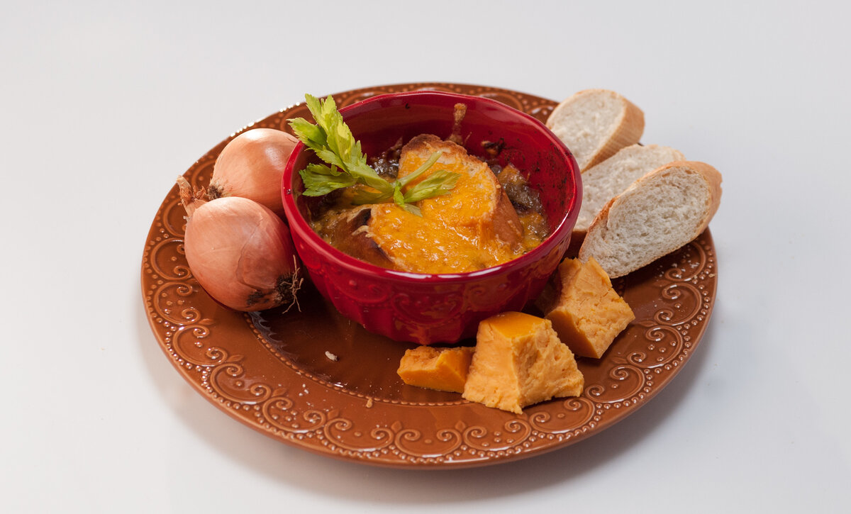 соль Способ приготовления 1. В сотейник наливаем растительное масло. Очищаем лук и нарезаем любым удобным способом. Отправляем лук к маслу, добавляем щепотку сахара и оставляем тушиться на 50-60 минут, время от времени помешиваем. 2. Когда лук готов, откидываем его на сито, чтобы избавиться от лишнего масла. Перекладываем лук в сотейник и добавляем немного муки, тщательно перемешиваем. Добавляем вино и сахар. Через пару минут, когда вино выпарится, добавляем бульон. Варите на медленном огне пятнадцать минут. 3. Суп наливаем в тарелку, сверху кладем пару кусочков багета и добавляем тертый сыр. Чтобы сыр слегка подрумянился, ставим тарелку с супом в духовку на 5 минут при температуре 200 градусов. 4. Приятного аппетита! Еще больше рецептов на сайте tveda.ru Любите читать Дзен Телеканала «Еда»? Расскажите свое мнение о материале в комментариях и ставьте лайки