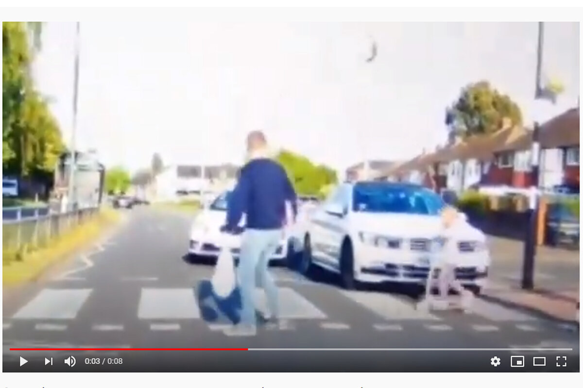 34-летний Джейсон Пейн из Англии вместе со своей семьей возвращался домой и переходил дорогу, когда водитель одной из стоящих перед пешеходным переходом машин, вдруг тронулся с места. На видео с камеры видеорегистратора видно, как машины стоят перед зеброй, ожидая, пока семья пройдет, а потом один автомобиль обгоняет другой и едет прямо на 5-летнюю девочку, которая катится по зебре на самокате. Джейсону пришлось прыгнуть перед машиной, ударив ее по капоту, чтобы тот не задел его маленькую падчерицу. Девочка отскакивает назад, а Джейсон ругает водителя. Кадрами в социальных сетях поделилась Элизабет, мама Грейси, в надежде поймать нерадивого водителя. Под видео она написала: «Мой муж стучал по капоту, а водитель вместо того, чтобы остановиться, продолжал ехать, извиняясь при этом. Я сообщила в полицию, они сейчас этим занимаются, но вдруг кто-то его узнал, пожалуйста, напишите мне». Сцена вызвала возмущение пользователей сети. Один мужчина написал: «Спасибо водителю, который записал на