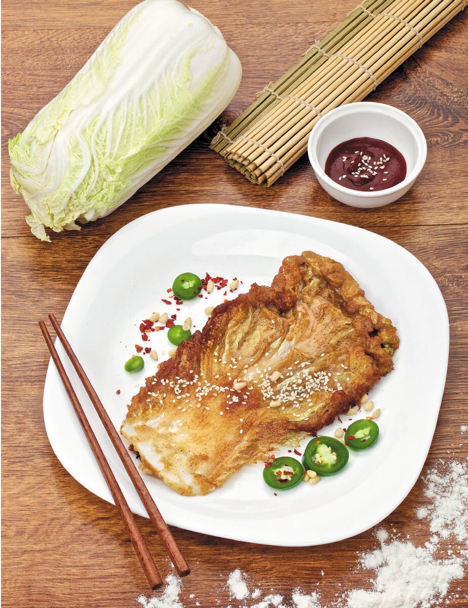 Блинчики-чоны в Корее могут пожарить, мне кажется, из чего угодно. Это не совсем блинчики в нашем понимании – иногда их называют оладьями и даже «корейской пиццей». Как правило, готовятся они по такому принципу: на сковородку выкладывается измельченная начинка, которая заливается густым тестом. Однако в широком смысле чоном можно назвать любые овощи и даже морепродукты, нарезанные и обжаренные в мягком кляре. И даже целые листья, например, пекинской капусты. Получается необычное и даже праздничное блюдо. 1. В идеале в чоне должно получиться полностью пропеченное, чуть поджаристое на краях тесто и еще немного хрустящая, «живая» растительная составляющая. Лучше брать не длинные, но широкие и плотные листья. Твердое основание листа нужно отбить обратной стороной ножа или скалкой, после чего разложить каждый лист на столе, стараясь сделать его максимально плоским. 2. Готовим кляр: на стакан воды потребуется полстакана муки, разрыхлитель на кончике ножа, три-четыре ложки соевого соуса и ч