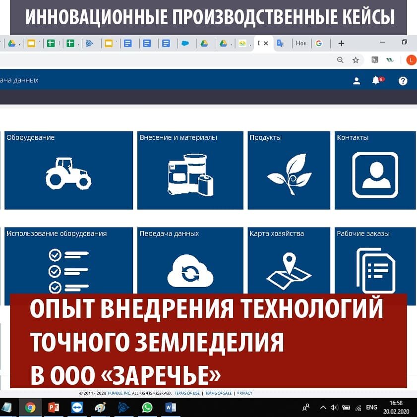 🔸 Продолжаем знакомить вас с производственными кейсами из нашего уникального каталога «Опыт внедрения инноваций аграрными предприятиями России». 🔸 Сегодня вашему вниманию представляем практику внедрения технологий точного земледелия с новыми IT-решениями Trimble. 🔸 Место внедрения новинки: ООО «Заречье» (Краснодарский край). Предприятие основано в 1991 году. Площадь селхозугодий составляет более 2500 га. Имеются собственные перерабатывающие мощности. Компания занимается производством сухих завтраков. Продукция реализуется под собственной торговой маркой «Слимко». 🔸 Производитель: Trimble 🔸 Мы взяли интервью у Антона Слюсаренко, заместителя генерального директора ООО «Заречье» (не является рекламой): 📝 «Сегодня технологии развиваются очень высокими темпами. И если не начать сейчас применять их в производстве, потом можно просто «отстать от поезда». В сельском хозяйстве внедрение новых технологий – это интенсификация производства, эффективное использование ресурсов, минимизация пре