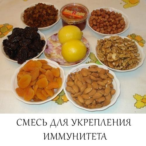 1. 300 г очищенных грецких орехов, 300 г кураги, 300 г изюма и 3 лимона с цедрой пропустите через мясорубку и добавьте 1 ст. ложку меда. Принимайте по 1 столовой (взрослым) и 1 чайной (детям) ложке в день. Лучше утром натощак или перед обедом, за час до еды. Можно принимать и на ночь. Храните в холодильнике.