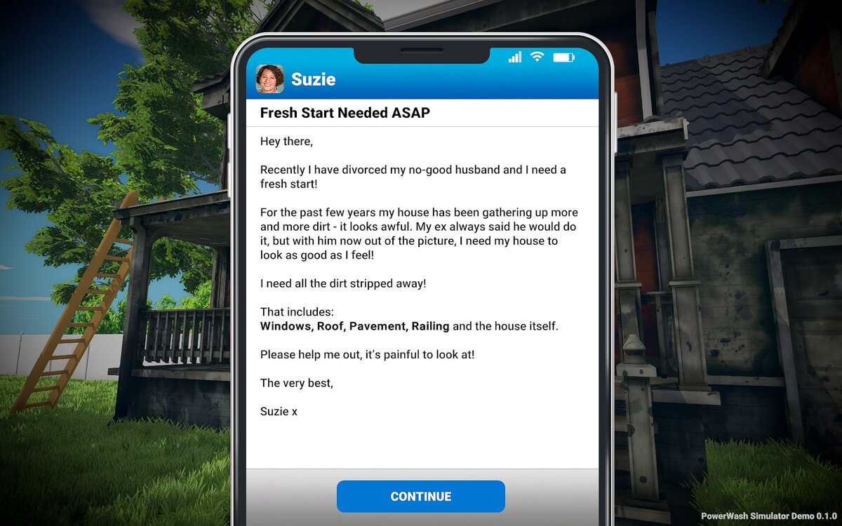 С этой статьи начнется серия других постов про игры с сайта Itch.io, где каждый желающий может выставить свою игру. С этого сайта зачастую выходят и большие проеткы, которые потом можно заметить с стиме. Сегодня же у нас на обзоре игра Power Wash Simulator. В начале игры нам приходит сообщение что нужно помыть окна, крышу и т.д. И затем мы появляемся возле грязного дома. Единственный вопрос - как можно было загрязнить дом. Но ответа нам не дают, а дают задачу - сделать все ярким и сеяющим. Для выполнения этой задачи нам дают 3 вида моек. Первая моет по области, но медленнно, вторая - линию и третья - очень мощная струя, бьющая в точку. И собственно всё, что нам нужно делать, это мыть. Следить за прогрессо можно в правом верхем углу. В целом игра довольно короткая, но перфекционистам оторваться будет сложно, из-за того что хочется все доделать идеально до конца. Игра конечно иногда подтормаживает из-за того, что это всего лишь демо версия. Но разработчик в новой версии говорит нам, что