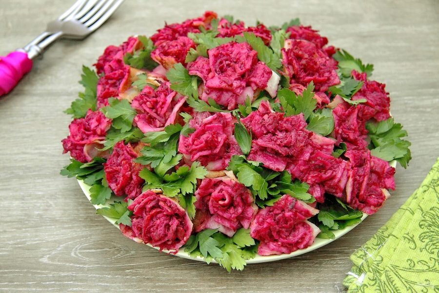 И так Состав : 1. 500 г. куриного филе . 2. 4 вареных яйца . 3. 200 г. моркови и 500 г. шампиньонов . 4. 200 г. грецких орехов и 2 свеклы . 5. 1 зубчик чеснока ,4 сырых яйца ,майонез,соль,перец . 6. 300 г . сыра твердых сортов . Процесс приготовления ; Варенную морковь и варенное куриное филе мелко нарезать . Шампиньоны и лук мелко нарезать и обжарить по отдельности . Вареные яйца и сыр нарезать кубиками,орехи натереть на терке . Все смешать ,заправить майонезом и выложить горкой на блюдо . Пожарить 2 блинчика из взбитых яиц . Смешать натертые на мелкой терке отварную свеклу и чеснок , заправить 2-3 столовой ложки майонеза. Тщательно смазать каждый блинчик свекольной смесью, свернуть в трубочки ,нарезать поперек небольшими кусочками 1,5 см., из которых в середине салата выложить "розочки".Украсить зеленью. Совет от автора : Если лень жарить блинчики из яиц,то можно использовать листы лаваша, готовые блины или листья салата . Один раз даже листья пекинской капусты пошли в дело ,