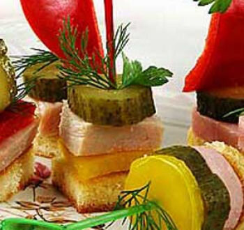 В последние годы хозяйки все чаще угощают гостей немудреным блюдом с «ненашим» названием: канапе. Что же скрывается под этим изящным словом? Представьте, обычные бутерброды. Вернее, не совсем обычные. Изобретательные французы, а именно оттуда пришло к нам это изобретение, подразумевают под «канапе» крошечные бутерброды граммов по 60, наколотые на специальные шпажки. Ухватил – и в рот, не откусывая. Таких рецептов существует великое множество. И все вкусные. Мы же остановимся лишь на одном: канапе с бужениной и ветчиной. Ингредиенты: 😟 Не подходят? Подберите другой рецепт в категории «Канапе»! 😉 Рецепт: Шаг 1: обжариваем хлеб. Шаг 2: режем остальные составляющие. Шаг 3: формируем канапе. Шаг 4: подаем к столу. Полезное: ★ Советы, идеи и комментарии к рецепту Канапе с бужениной и ветчиной ★ Другие рецепты в категории Закуски и Канапе ★ Автор рецепта: Игорь Суднищиков © 20.02.2012
