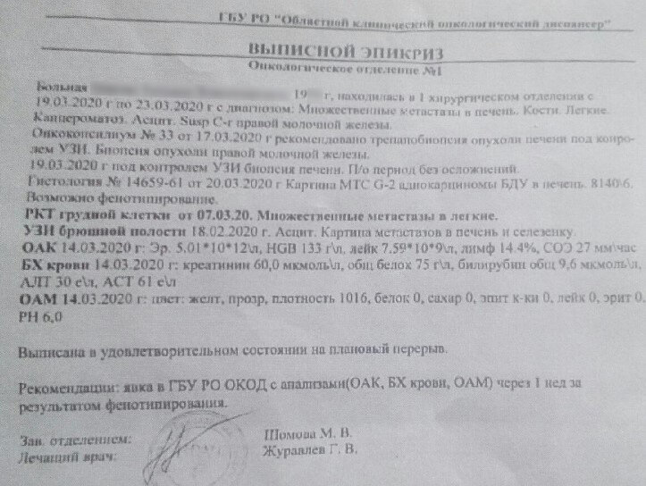 В результате всех мытарств был поставлен диагноз: рак молочной железы с множественными метастазами в печень, легкие, кости и позвоночник.