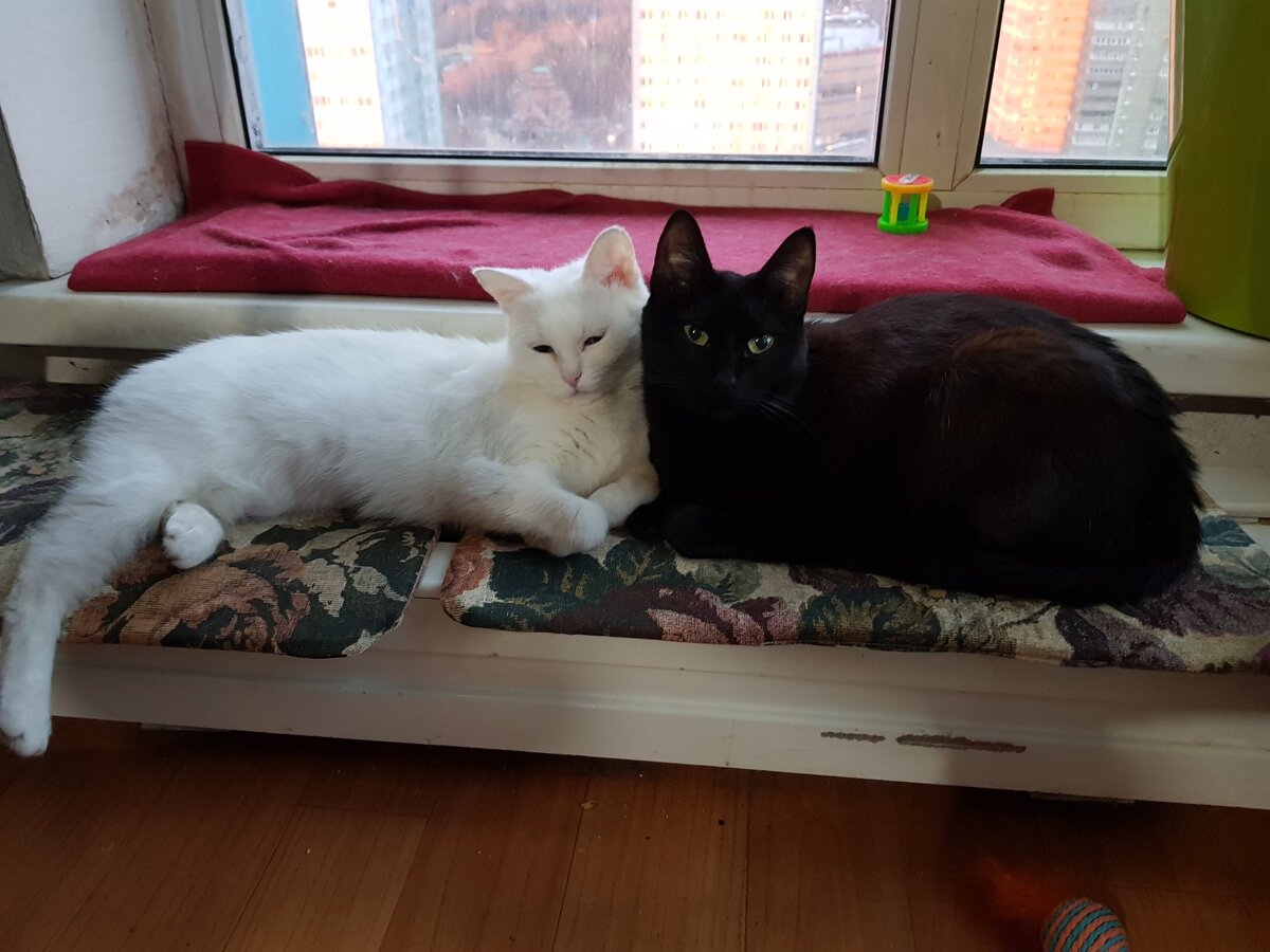 Долгожданный совместный привет из дома передают наши выпускницы: чёрная кошечка Галочка (теперь Нюша), которая уехала из приюта домой 28 декабря 2019 года, и белая – Миюша (теперь Ася-Белася), которая уехала из приюта домой 28 января 2020 года. «Я взял из приюта «МУРКОША» 2-х кошек: чёрную Галочку, которую переименовал в Чернюшу, сокращённо Нюшу. И белую Миюшу, переименованную в Беласю – Асю. На фото из приюта МИЮША – первые дни, когда их туда принесли волонтёры. Кошки напуганы и смущены. 🥺 Прошло меньше полгода в моем доме, и они уже подружились, то лижут друг друга, то кусают, бегают наперегонки, едят из чужих плошек, спят и играют то вместе, то раздельно». Отличная новость! Мы нисколько не сомневались, что такой заботливый хозяин поможет своим питомицам справиться с адаптацией в новом доме и подружить их между собой. 👯♀️ «Я не хозяин для кошек – это неточный термин. Кормитель, ухаживатель, член стаи (семьи), полезное существо, которому стоит уделить своё внимание для пользы себя