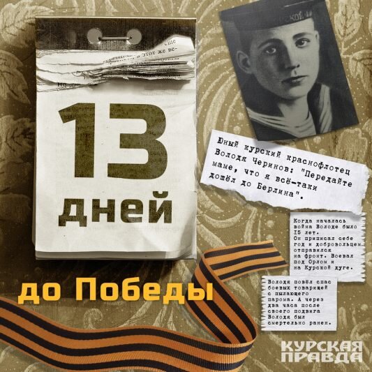 Наш земляк Володя Черинов из Золотухино самоотверженно сражался в рядах Днепровской флотилии. Победу над фашистами ему увидеть не удалось. Володя погиб в апреле 45-го во время форсирования реки Шпрее. Наш земляк Володя Черинов из Золотухино самоотверженно сражался в рядах Днепровской флотилии. Победу над фашистами ему увидеть не удалось. Володя погиб в апреле 45-го во время форсирования реки Шпрее. Когда началась война, Володе было 15 лет. Он приписал себе год и добровольцем отправился на фронт. Воевал под Орлом и на Курской дуге. Свой последний бой краснофлотец Черинов принял 24 апреля 1945 года. Отряду катеров, на одном из которых служил мотористом Володя, поступила команда обеспечить форсирование воинской части через реку Шпрее к самому центру Берлина. Форсирование начали ночью, под ураганным огнём фашистов. Высадили первый десант, второй, третий. Когда тяжело был ранен командир, Черинов принял командование катером на себя. За ночь переправили с берега на берег 500 десантников