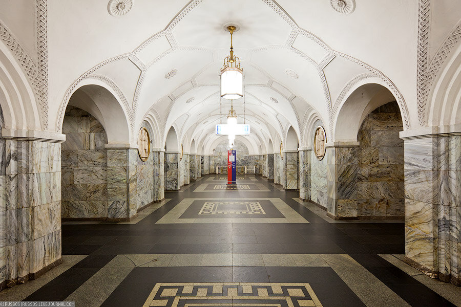 Главный архитектор станции И. Е. Рожин поставил перед собой определённую задачу — зрительно облегчить массивную конструкцию пилонов станции глубокого заложения. Необходимо упомянуть тот факт, что такая проблема стояла практически перед каждым архитектором глубоких станций московского метро, и зачастую эта задача решалась не с той лёгкостью, с которой хотелось бы. Рожин прорезал внутри каждого пилона профилированную арку, визуально разделяющую массивные опоры на четыре угловые колонны, на которых, как кажется пассажиру, и лежит сам свод. В случае, если бы станция была бы облицована светлым мрамором, говорят специалисты, дизайн получился бы ещё более лёгким, и станция не была такой серой. Однако, реализовать таковую задумку не получилось, и для облицовки пришлось использовать мрамор марки «лопота», а для путевых стен — сочетанием марок мрамора «садахло» и чёрного «габбро». Цоколь пилонов оформлен тёмно-красным мрамором «салиэти».
