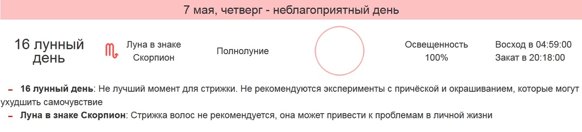Лунные сутки Фаза луны Луна в знаке зодиака День недели Влияние Луны 7 мая 2020 года 15 лунный день 15 лунный день – не лучшее время для визита к парикмахеру. Стрижка может привести к травме, неудачам или головной боли. Поэтому лучше отложить обновление образа до более благоприятного периода. Красить волосы разрешается. Желательно выбирать цвет на пару тонов темнее натурального. Это защитит от возможных неприятностей дня. Не стоит кардинально менять прическу. Рекомендуется просто собрать волосы на затылке. Лучше оставить их ровными, не завивать. Полнолуние Полнолуние – подходящее время для любых манипуляций с волосами. Это благоприятная пора для кардинального изменения образа. Стрижка в этот период поможет избавиться от накопившегося негатива и улучшит самочувствие. После нее волосы станут послушными и густыми, перестанут путаться. При окрашивании лучше выбирать цвет на несколько тонов темнее натурального. Полезно делать питательные и укрепляющие маски для волос. Луна в Ско