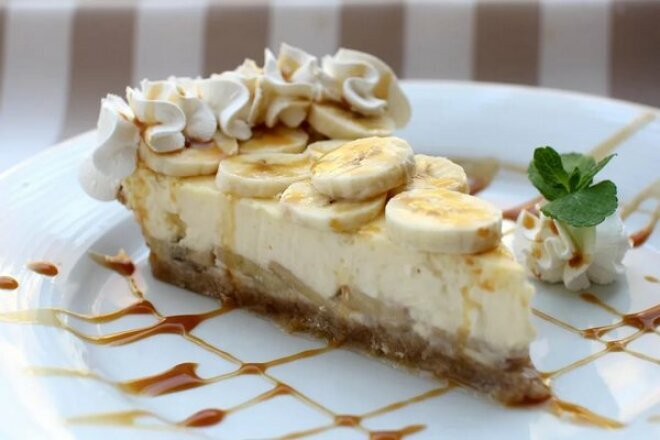 ИНГРЕДИЕНТЫ: Таблица мер для основы: для крема: творог 9%400 г сливки 33%200 мл сметана 15%100 гжелатин8 гбананы3 шт.мед светлый4 ст.л.лимон(сок)3 ст.л.сахарная пудра2 ст.л.сахар ванильный1 ч.л.лимон(цедра)1 ч.л. ПРИГОТОВЛЕНИЕ: СОВЕТ Блюдо можно украсить тертым темным шоколадом, свежими ягодами клубники, ежевики, малины, вишни. Мед в начинку можно не добавлять.