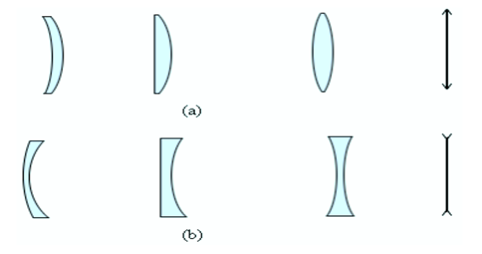 Собирающие (a) и рассеивающие (b) линзы и их условные обозначения.