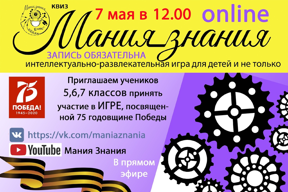 Добрый день. Сегодня я расскажу про игру (в условиях самоизоляции мы проводим её онлайн), которая посвящена 75 годовщине Победы ! Состоится игра 07 мая 2020 в 12:00 по Москве. В игре могут принять участие команды 5,6,7 классов из различных школ! Для записи на игру необходимо заполнить заявку: https://forms.gle/fM3WbKsXCcfqgy7V6