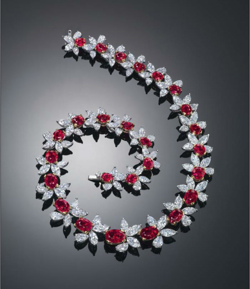 Это роскошное украшение выполнено из 26 кроваво-красных бирманских рубинов различного веса (от 1.27 до 5.38 карат) общей массой 62,46 карат, каждый из которых сопровождается гроздью из бриллиантов огранки маркиз и груша.