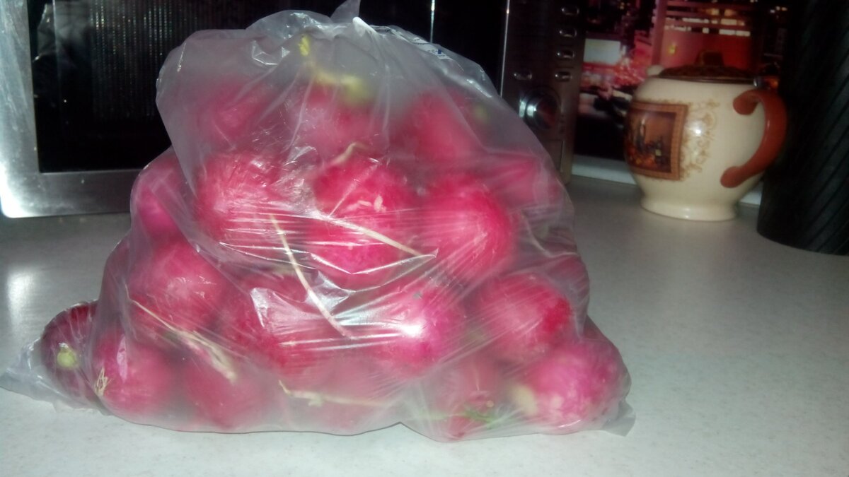 Привет, привет !!! Как вы думаете, какая бывает редиска? Редиска бывает горькая, бывает послаще, сочная, суховатая. Подумаешь просто редиска. Что про неё писать? Мы всегда сажали её в деревне, у себя на даче, теперь сажаем в парнике. И всегда поспевала раньше всех. Мы успевали наесться до отвала. И как говориться нас не удивить ! Но не в этот раз. Никогда бы не подумали, что такое возможно ! Заехали в " Светофор" и были крайне удивлены. Что это? Да что тут удивляться? - спросите вы. Просто редиска. Хорошо. А так ? Ну ладно, бывает и такая редиска. Подкормить немного и вырастет на славу. Не думайте, что у меня такая маленькая ладонь. Редиску можно сравнить со средним клубнём картофеля. А теперь вот так !!! Как яблочко наливное!!! Что могу написать про вкус? Пишу - ВКУСНО !!! Сочная !!! Мякоть белая, с приятным среднеострым вкусом и то