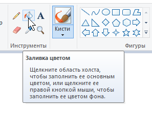 В меню с общим именем "Инструменты" есть инструмент в виде банки с краской или ещё говорят ведро с краской.