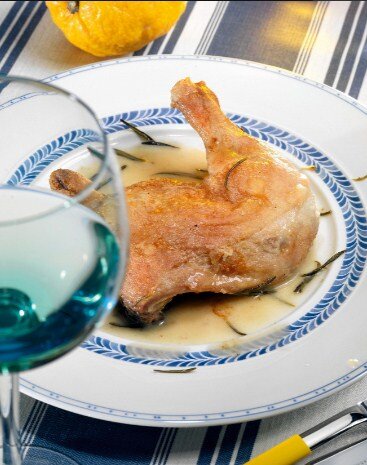 ИНГРЕДИЕНТЫ Куриные окорочка 4 штуки Крупная соль по вкусу Перец черный молотый по вкусу Пшеничная мука 100 г Оливковое масло extra virgin 50 мл Белое вино 220 мл Свежий розмарин 3 стебля Лавровый лист 2 штуки Лимонный сок 20 мл ИНСТРУКЦИЯ ПРИГОТОВЛЕНИЯ 1. Разогреть духовку до 220 градусов. Куриные окорочка с кожей натереть солью и перцем со всех сторон. На большое блюдо просеять муку и обвалять в ней окорочка. 2. На огнеупорной сковороде разогреть масло и на среднем огне обжарить мясо в течение десяти минут с обеих сторон до появления золотистой корочки. Затем влить вино, бросить в сковороду розмарин и лаврушку, уварить жидкость в течение двух минут. Затем влить полтора стакана воды, довести до кипения и снять с огня.