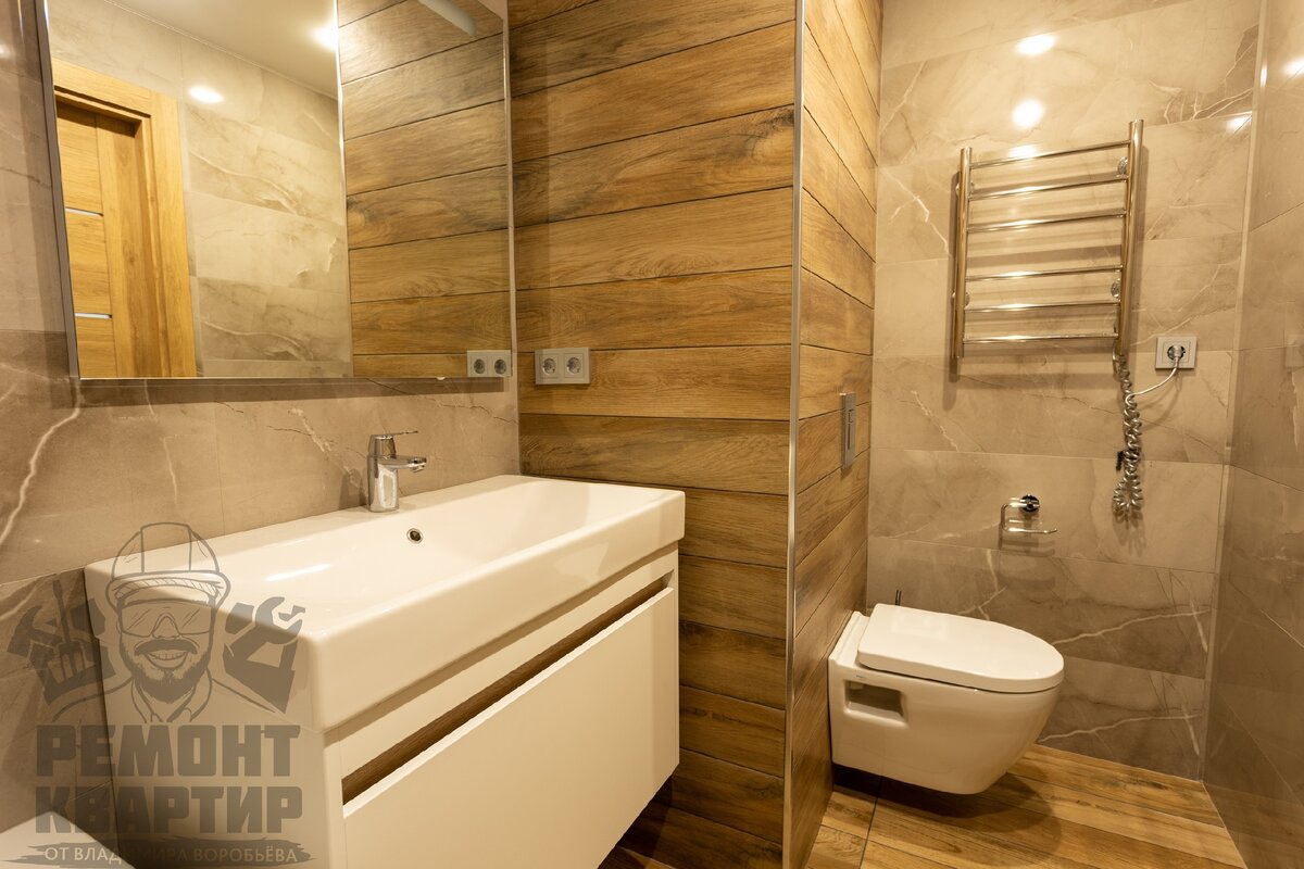 На так давно нами был закончен ремонт санузла в одной из Московских квартир. Сейчас очень актуальны дизайны интерьера, когда все выполнено с имитацией природных материалов (те, кто пообеспеченнее, могут использовать и натуральный камень и дерево). В данном ремонте использован отечественный керамогранит под дерево и мрамор. Смотрится очень по-современному, не вычурно. Полотенцесушитель выбран электрический, ванна акриловая. Выполнен люк скрытого монтажа, не портит внешнего единого стиля ванной комнаты. Унитаз-подвесной, все по последнему веянию моды. Как Вам этот вариант дизайна санузла? Хотели бы такой же? Попробуете отгадать общую стоимость материалов и работ? Пишите свои догадки в комментарии, а кто был наиболее близок, узнаем в моем скором посте, где я отснял видео с подробной сметой данного ремонта. Следите за обновлениями, вдохновляйтесь для реализации своих новых ремонтов! Владимир Воробьев +7 (977) 821-46-07