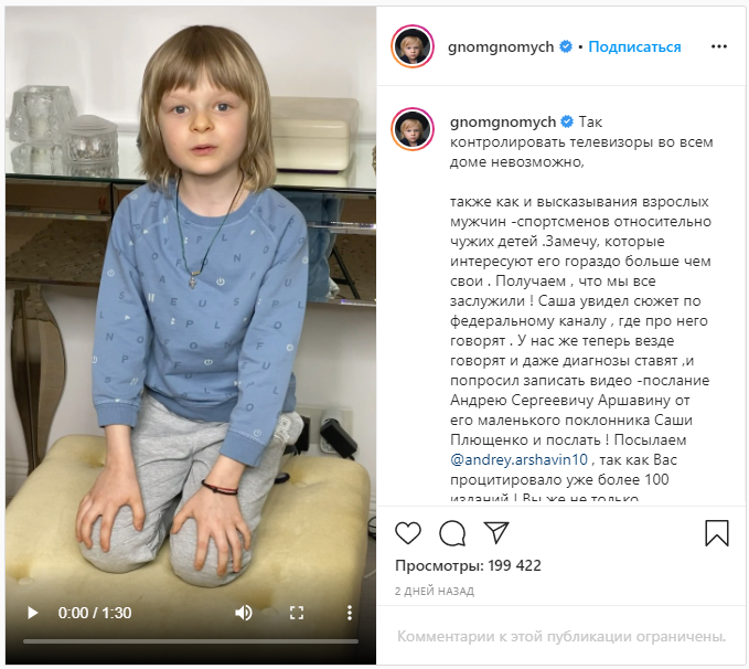 Сдаётся мне, что в этом и причина вашей злобной мести. Хотя, почему мести? Вроде бы ничего плохого, кроме любви и дружбы, мы вам не дарили. Зависти? Скорее, в этом нахожу причину. Мы с Женей нашего прекрасного ребёнка не прячем, у него с 6 месяцев есть страница в инстаграме, и каждый может посмотреть, как Саша катается на льду, играет с друзьями и собаками, участвует в соревнованиях, его хобби и путешествия. Наш сын абсолютно здоров, это даже трудно подвергать сомнению.