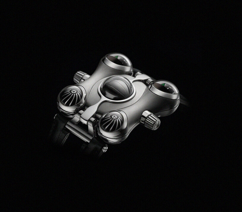 Футуристические наручные часы MB & F модель HM6 были разработаны специально для нескромно богатых людей, которые могут себе позволить настоящее космическое путешествие. Часы предназначены для работы в условиях агрессивной среды и благодаря своему механизму особенно хороши в условиях невесомости. Конечно, сложно назвать это часами, формфактор совсем несвойственный для наручных часов, такому девайсу больше подходит название: часовая машина. Помните, мы писали как устроены Берлинские часы (крайне рекомендуем к ознакомлению). Здесь нет хитрых систем вычисления, но с первого взгляда не все так просто. Эти космические часы оснащены прозрачными полусферами из сапфирового стекла, которые размещены на каждом из 4-х углов биоморфного корпуса. Два полусферических индикатора спереди показывают часы и минуты, вместо привычного круглого циферблата здесь он шарообразный с нанесенными на него соответствующими метками. На противоположной стороне размещены аналогичные полусферы, чуть меньшего разме