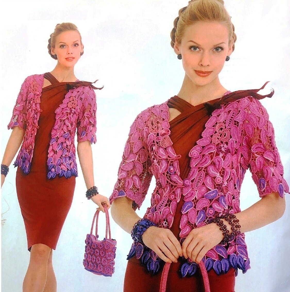 Итак, жакет из журнала "МОД", автор модели Ольга Кривенко. При создании жакета автор рекомендует использовать более плотное полотно, чтобы жакет хорошо держал форму, также этому способствуют отдельные элементы на бурдоне. Плавно вплетенные в композицию завитки жемчужного шнура выполняют и утилитарную роль навесных петель, что очень практично и красиво. Красочные тональные переходы пряжи, темный низ жакета и более светлый и яркий верх всё это классические приёмы, позволяющие выгодно подчеркнуть достоинства фигуры.