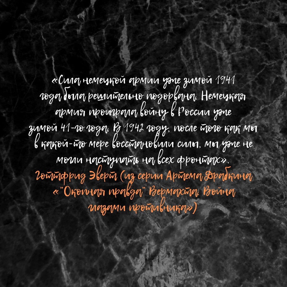 Готтфрид Эверт (из серии Артема Драбкина «”Окопная правда” Вермахта. Война глазами противника»): «Сила немецкой армии уже зимой 1941 года была решительно подорвана. Немецкая армия проиграла войну в России уже зимой 41-го года. В 1942 году, после того как мы в какой-то мере восстановили силы, мы уже не могли наступать на всех фронтах».