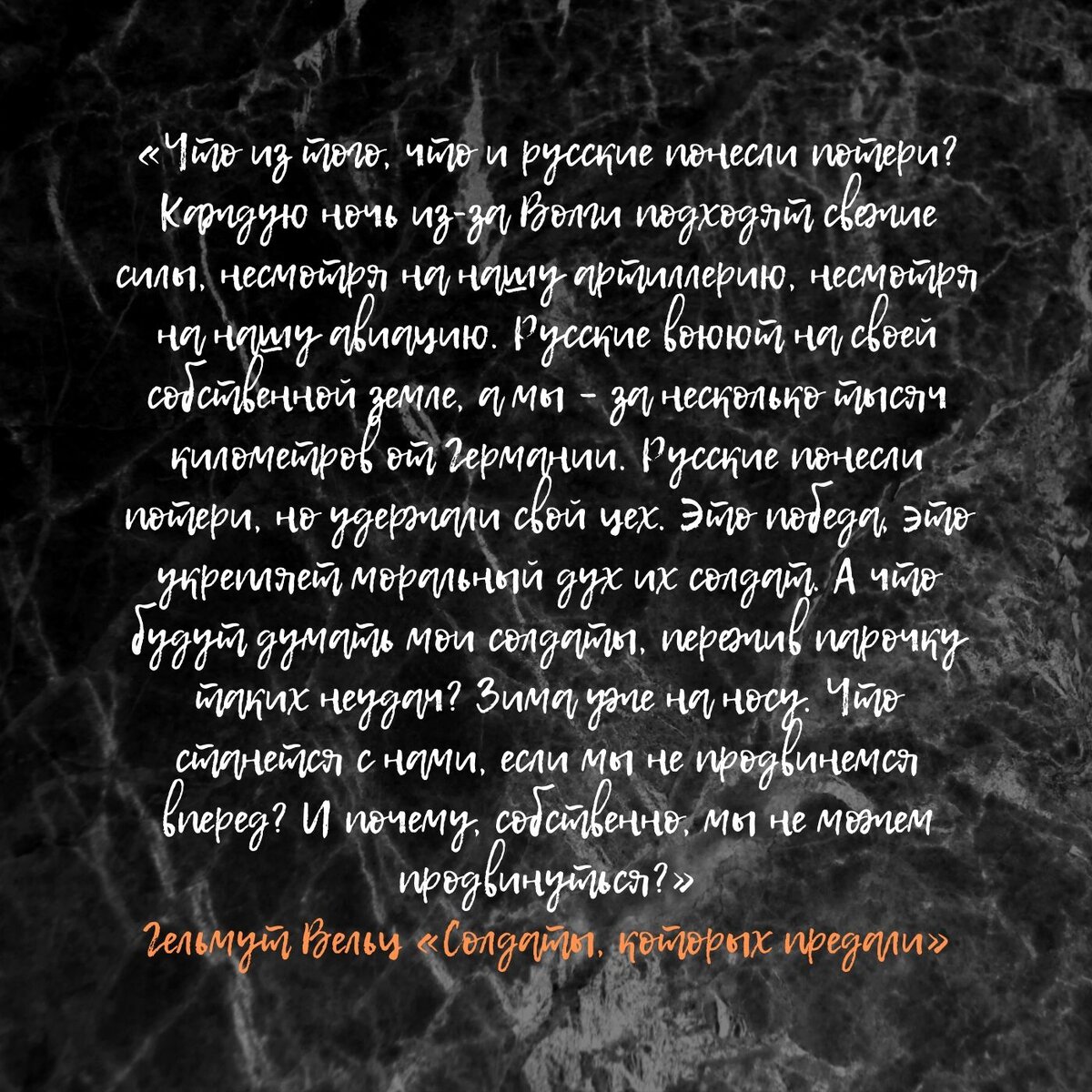 Гельмут Вельц «Солдаты, которых предали»: «Что из того, что и русские понесли потери? Каждую ночь из-за Волги подходят свежие силы, несмотря на нашу артиллерию, несмотря на нашу авиацию. Русские воюют на своей собственной земле, а мы – за несколько тысяч километров от Германии. Русские понесли потери, но удержали свой цех. Это победа, это укрепляет моральный дух их солдат. А что будут думать мои солдаты, пережив парочку таких неудач? Зима уже на носу. Что станется с нами, если мы не продвинемся вперед? И почему, собственно, мы не можем продвинуться?»