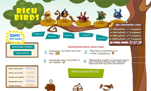 Здравствуйте! Сегодня я расскажу про один очень интересный за последнее время распиарившийся сайт Rich-Birds.com. Последнее время блоггеры очень участили рекламировать его, рассказывать про то, какой это крутой сайт, что с него можно выводить деньги и т.д. Я расскажу на своём опыте, какой это «крутой» сайт. При регистрации можно получить 1000 серебра в подарок. Почему не стоит вносить деньги в Рич Бёрдс? Во первых, как я понимаю, здесь разводят людей. Говорят, даже были случаи, если много внести денег (серебра), потом купить много птиц, они принесут вам много яиц, серебра и через какое-то время вы захотите вывести большую сумму денег, вас администраторы могут забанить, к примеру, или сделать так, что у вас больше не работает аккаунт сайта Rich birds. Если вы им напишите, почему так, верните мои деньги, они скажут вам нет, извините, мы не можем вернуть вам деньги, так как в правилах сообщества сайта написано, что администратор всегда прав и, что мы не несём ответственность, за то,