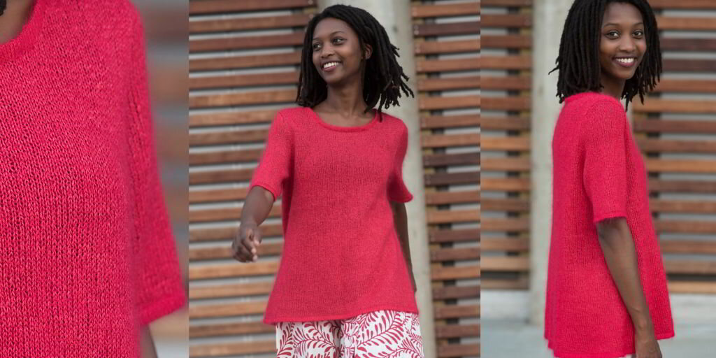 Кофточка - топ с коротким рукавом, связанная спицами по кругу снизу вверх одной деталью до проймы, после которой полочка и спинка заканчиваются отдельно. Женская кофточка от дизайнера Shellie Anderson вяжется в две нити, взяв летнюю тонкую ниточку и тонкий мохер, а кромки выполняются в две нити мохера. Легкий трапециевидный А силуэт добавляет динамики нижнему краю. Описание