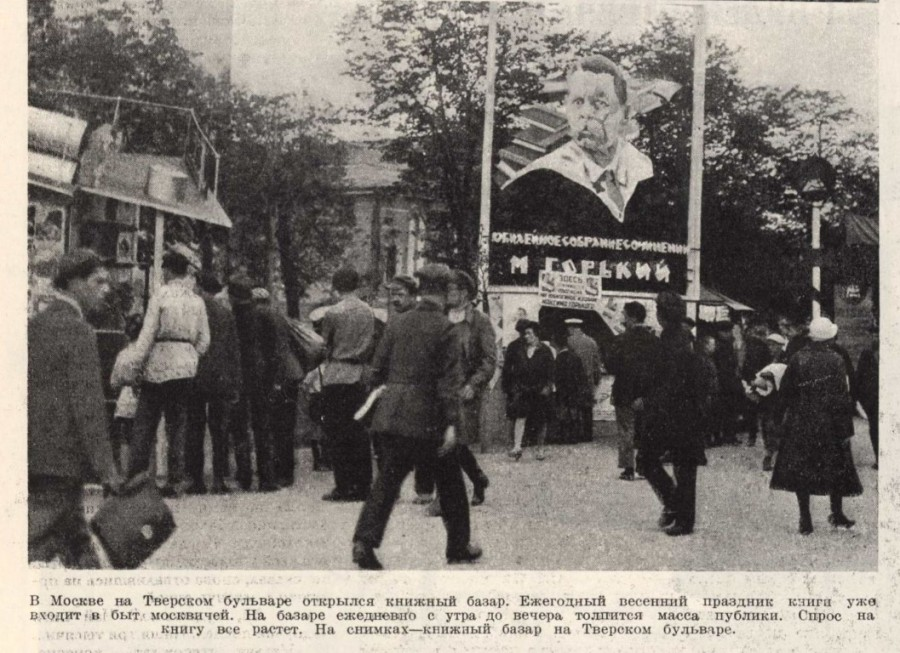 Развитие книготорговым предприятиям и частной книжной торговле дала проводившаяся в стране новая экономическая политика в 1920-е годы. Политика государства по книгопечатанию и распространению В 1922 году Был создан Торговый сектор (Торгсектор) Госиздата РСФСР, который отвечал за продвижение книг. В 1926 году в Москве был открыт центральный оптовый склад для Торгсектора. Лозунг "Книгу — массам!" обозначал работу книготорговцев. Одним из основных помощников в этом стал первый книжный базар, состоявшийся 5 мая 1926 года на Тверском бульваре в Москве. Знаменательное событие Задолго до открытия бульвар заполонили москвичи. В киосках были выставлены тысячи книг различных жанров с большими скидками. Организовано множество лотерей и конкурсов, например – ловля книги сеткой, стоила такая "добыча" 20 копеек. Большой популярностью пользовались книги "Огонька", особенно – дешевые. Мероприятие получило значительный отклик, показав, что знакомить читателей с книгами стоит начинать и в провинции. Кст