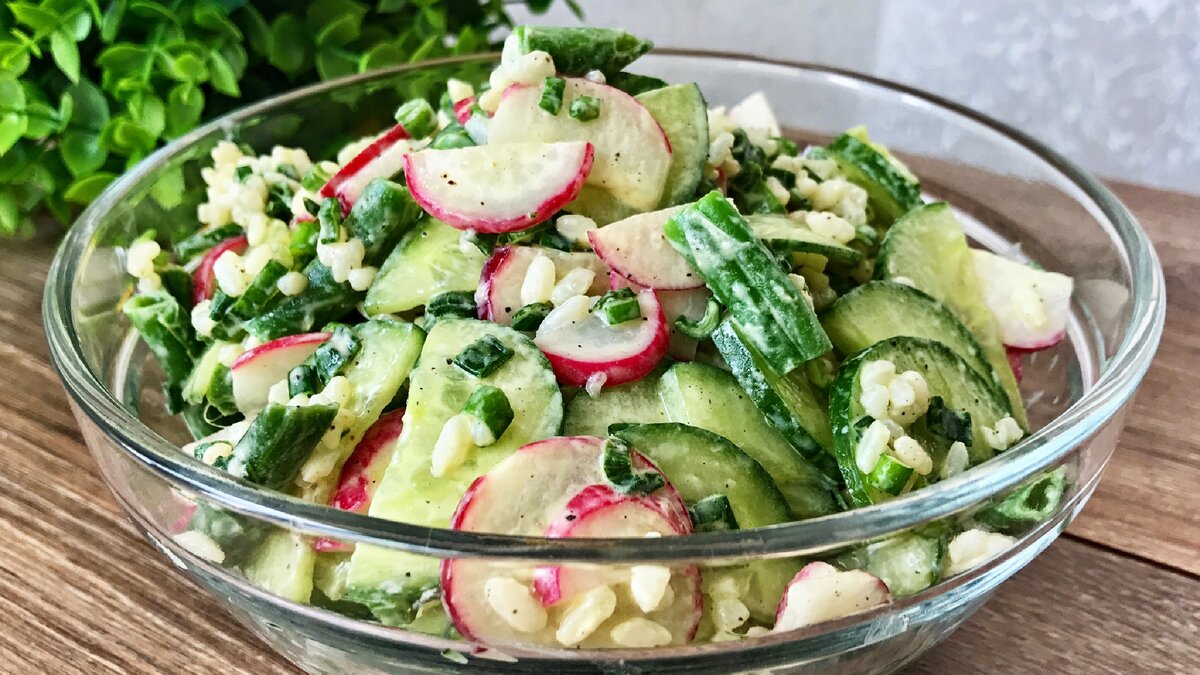 Лето уже не за горами, поэтому сегодня приготовила полезный салатик. Вкусно и сытно! Можно есть и утром , и днём , и вечером! РЕЦЕПТ Подробный пошаговый видео-рецепт можете посмотреть Здесь: 1. Отвариваю 40 г риса. Режу полукольцами 4-5 шт редиски и 2 небольших огурца.