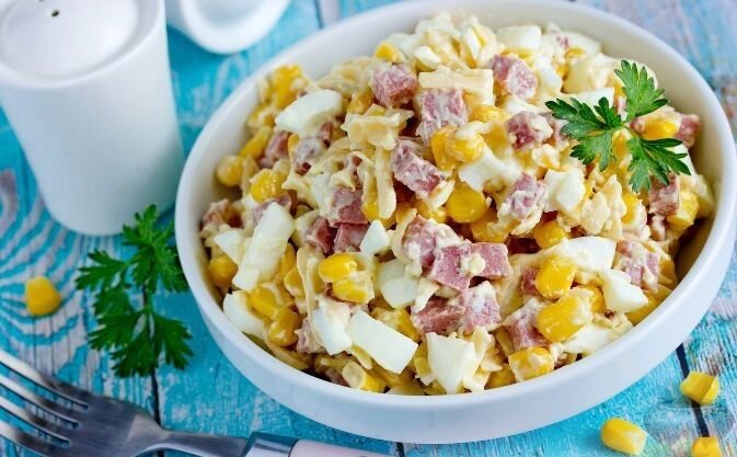 ИНГРЕДИЕНТЫ ПРИГОТОВЛЕНИЕ 1. Яйца сварить и очистить. 2. В миску нарезать кубиками яйца и колбасу. 3. Добавить сыр и кукурузу. 4. Заправить майонезом и перемешать. Приятного аппетита!