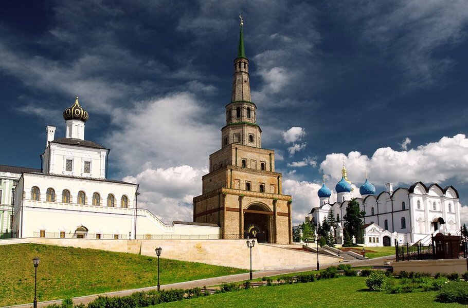дна из немногих в мире падающих башен находится в Казанском кремле. Ее история окутана тайной, известно, что построена она во второй половине XVII века, автор проекта неизвестен. Наклон башни Сююмбике составляет 1,8 метра, а высота 58 метров. Рядом с достопримечательностью располагается Губернаторский дворец и Дворцовая (Введенская) церковь. Сююмбике хранит немало тайн и ее история до сих пор остается предметом горячих дискуссий. Строение состоит из пяти ярусов из красного обожженного кирпича, первые три представляют собой четырехгранники с уступами, удерживающие на себе два верхних яруса. В башне имеются две небольшие двери, ведущие к коридорам, из которых идут лестницы наверх. Первые три яруса имеют обходные галереи, а два последних заканчиваются кирпичным шатром, выполненным в виде восьмигранной пирамиды. Венчает башню шпиль с установленным на нем в 1993 году золоченым полумесяцем.