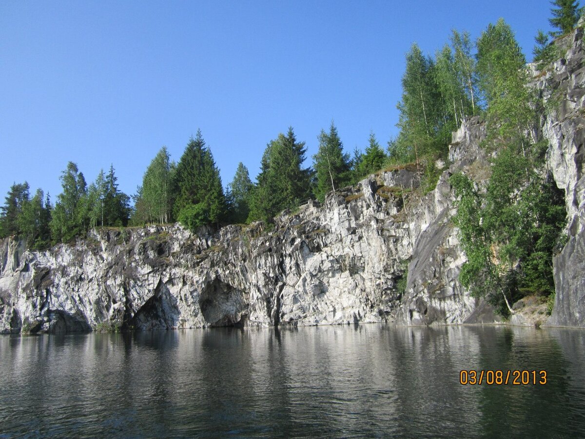 Рускеала, мраморный горный парк. Раньше здесь добывали мрамор, ещё при Екатерине 2. Мрамор есть во многих дворцах, соборах Санкт-Петербурга. В Исаакиевском, Казанском соборах, Эрмитаже и даже на станциях метро Ладожская и Приморская. В последнее время здесь проходит музыкальный фестиваль "Ruskeala Symphony", музыка разносится по всему горному парку. Живописное место, очень красивая природа, прозрачность воды примерно 15-18 метров. Когда во время войны перестали добывать мрамор, всё штольни заполнились водой. Воду не смогли выкачать. Теперь это туристический парк развлечения, но очень дорогой. Много сувенирных лавок, кафе и самое главное бесплатный туалет. В горном парке можно поплавать на лодке, тоже не из дешёвых развлечений. Выдают спасательные жилеты и ты сам плаваешь по всему каньону. Можно и в акваланге поплавать, посмотреть сказочных глубины каньона. По кругу каньона выложены дорожки, где можно любоваться великолепным видом парка. Я много раз была в парке, ещё за стала то время