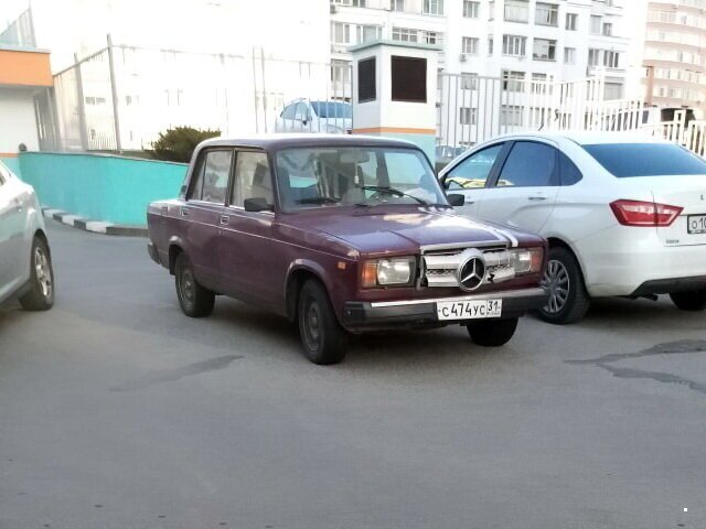 В сегодняшнем выпуске нелепого тюнинга вы увидите несколько попыток превратить Ладу в Mercedes-Benz, "пушку-гонку" из Волги, а также результат скрещивания ГАЗ-31105 и ГАЗели. Поехали! Не забывайте также посмотреть предыдущую часть >> Каждый владелец "Жигулей" мечтает о чем-то получше. Например, о Mercedes-Benz. Вот вам прекрасное доказательство моему смелому утверждению. Хозяин этой старенькой "семерки" приспособил поверх штатной решетке элемент решетки радиатора от "Мерседеса". С огромной звездой. Да, его старенькие "Жигули" не стали немецким автомобилем, но мечтать-то не вредно, правда? Но не все "Мерседесы" одинаково хорошие. Посмотрите, например, на этот. Его совсем недавно выставили на продажу в Швеции. Когда-то он был обычным 280 SE в кузове W126, но получил экстремальный тюнинг от своего владельца. Тот занизил крышу, добавил передние фонари от более современного E-класса, литые колесные диски и даже языки пламени из фейкового воздухозаборника. Цена? 23 000 шведских крон, или 172