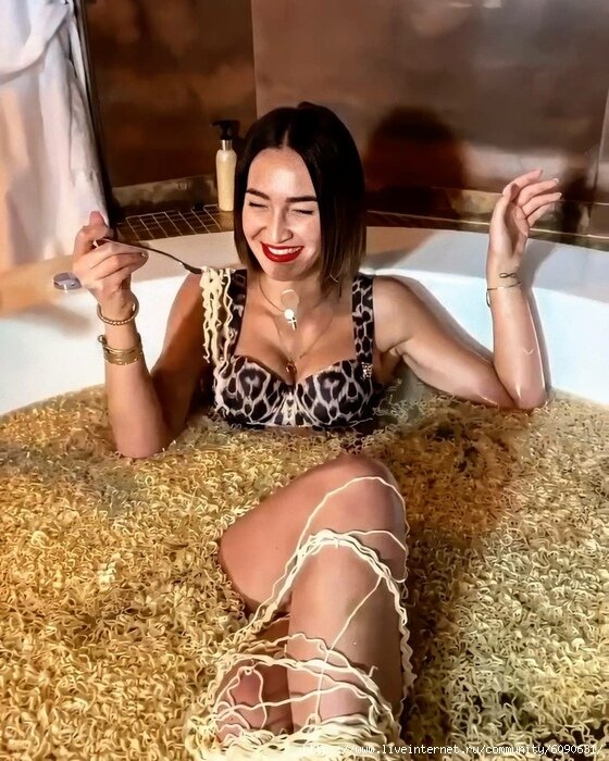 на днях принцесса шоу-бизнеса учудила очередное «шоу» — приняла в прямом эфире своего канала в Инстаграме ванну, да не простую, а с дошираком. И разозлила тем самым своих подписчиков. Для чего она это сделала — недоумевают и плюются пользователи? Телеведущая высыпала в горячую воду десятки пачек сублимированного продукта, подождала несколько минут, пока лапша растворится, а потом погрузилась в получившееся варево в леопардовом купальнике. К слову, это было одно из заданий в рамках игры-челленджа с таким же, как она блогером Гусейном Гасановым. Но ее подписчики отреагировали на такую «игру» отнюдь не восторженно. «Жалко макароны — сколько людей можно было бы накормить», — расстроился один из пользователей. «Людям жрать нечего, а они добро на г… переводят», — возмутился другой. «Только вдуматься, какой это низкий поступок! Игра не стоила того, чтобы такие вещи вытворять! Слишком это мерзко!», — высказал свое негативное мнение третий. «Грудь появляется с возрастом, а мозг — нет. Купатьс