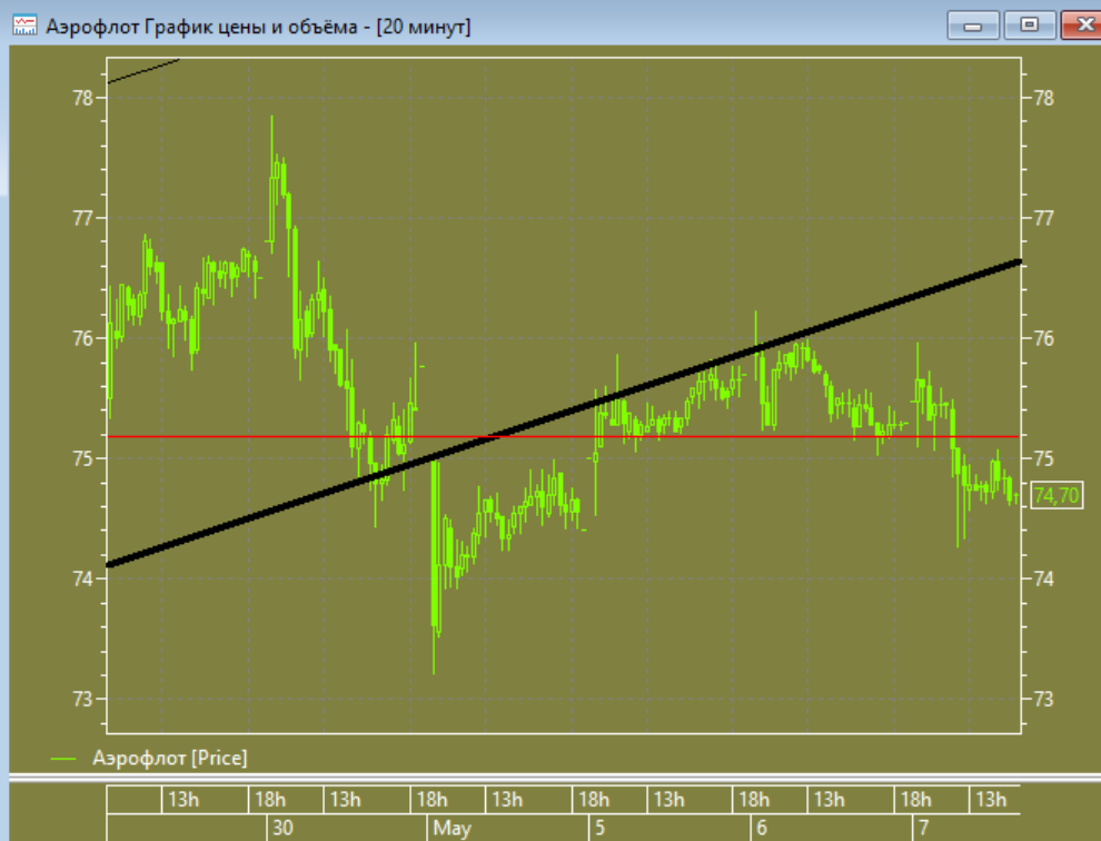 На рисунке изображен график акций компании Аэрофлот АО (20 минутный). Мы видим как «быки» пытаются вскочить на повышательный тренд (черная линия на графике) но у них ничего не получается. Это пример, чтобы показать то, что есть привязанность биржевой толпы к графикам. И эту привязанность можно использовать для того чтобы стать богаче. Я знаю примеры трейдеров, которые годами успешно работают на фондовом рынке. Никаких «супердоходов» у них нет, но зато они работают не по найму. Зато они хозяева своей жизни. Я сейчас открыл публичный фондовый портфель и принимаю торговые решения исключительно на основании технического анализа. Посмотрим, что будет с этим портфелем в конце года. Предыдущий опыт был успешным.