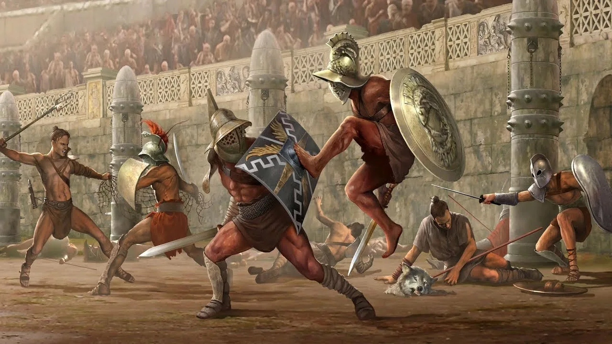 Гладиаторы — римские бойцы-рабы, участвовавшие в поединках на радость публике в Римской империи на протяжении почти 700 лет. Гладиаторами были: рабы, военнопленные, либо преступники, а иногда и простые граждане. Эти товарищи, нестарые и хорошо развитые, попадали в школы гладиаторов, где они под руководством управляющего проходили военную подготовку. Гладиаторы занимались каждый день с тренерами и учителями, которые обучали их владению разнообразным оружием. Также к услугам гладиаторов были повара, врачи и гетеры. Гладиаторы жили гораздо лучше обыкновенных рабов, однако это преимущество были ничем иным, как обычными инвестициями. Чем лучше жил гладиатор, тем лучше сражался, побеждал, следовательно, приносил большую прибыль. Некоторые гладиаторы могли добиться освобождения от рабства, однако таких было мало. Эти бойцы получали рудис — деревянный меч, знак освобождения от рабства. Часто они становились платными тренерами в своих же людусах (школах гладиаторов). Гладиаторские бои обычно