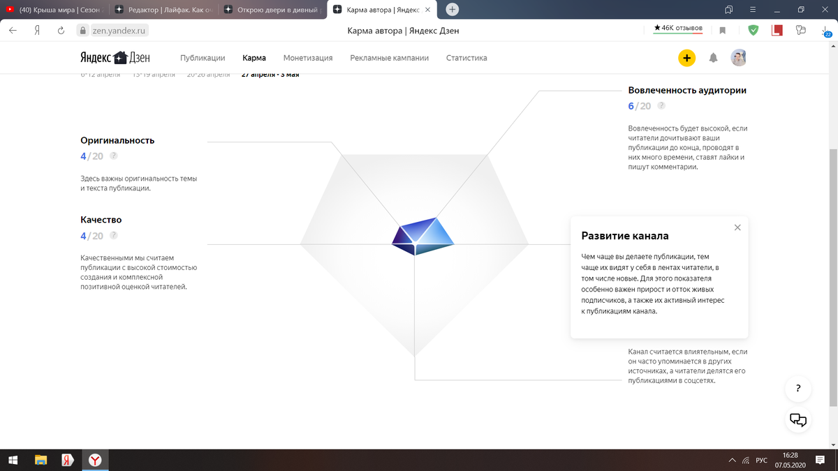 Когда вы заводите канал, у вас карма стоит по нолям. Это говорит о том, что метрика вашей популярности не рабочая. За работоспособность канала отвечает :